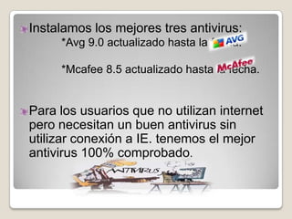 Los 10 mejores antivirus gratis Comparativa 2022 ¿Buscas el mejor antivirus gratuito? Entra y encuentra el que mejor se adapta a tus necesidades. Con estos antivirus tu ordenador estará más protegido. También ofrece seguridad contra el phising. Y puede analizar un usb para ver si tiene algún tipo de virus o no. Descargar Avira. Comodo Free.