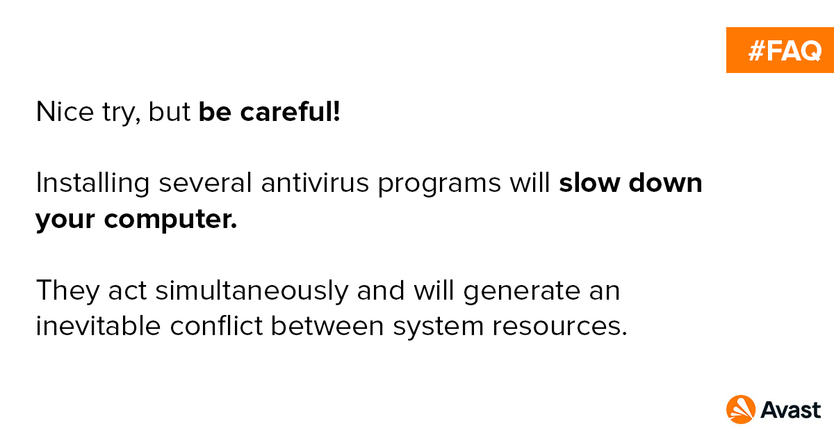 Two antivirus will slow down your computer - Techchore Some advanced computer users do install two antivirus programs in the same OS. But they make sure that the two programs do not both perform real time computer protection tasks. Typically, one does on-demand tasks that require the user to start and stop them manually while the other does the... Using more than one antivirus program hurts your computer Having two antivirus programs is like hiring two armies to take the same fortress. They have completely different fighting styles. When you run antivirus software, it scans for suspicious programs. It might detect the other AV program on your computer, not recognize it as a fellow... Running two antivirus programs will compete over viruses Running two antivirus programs at the same time is so bad, that it's the same as having none at all. Cyber security is, without question, a growing concern. In the face of such a massive online threat, you probably thought about installing two or more antivirus software on your computer.