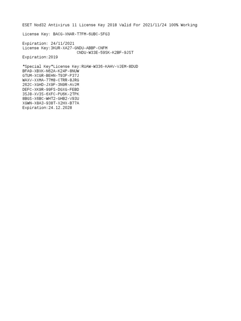 Free License Key ( trial license) ESET NOD32 Anti-Virus - Facebook Free License Key ( trial license) ESET NOD32 Anti-Virus - Facebook ESET NOD32 Antivirus Free License Key - SiberKalem.com Eset Nod32 Antivirus Current Key Serial License 2023 C4NU-XK9P-XRPS-FANV-BKXV H23C-X3JM-6SH5-FGRG-BUKF JJCR-XKV9-RRH5-5NRP-HGDN X89P-X7FW-VA4S-BKVM-UUNB VHSU-XVM5-V4UJ-2TUV-BDMF 9X4F-XGUM-PM8D-JXT8-X4B8 GH3R-XF22-WMWC-7F2P-29E7 BN76-XVMK-AFUG-KJH2-SBFS WJRU-XF6F-6CDH-BEC6-H2XH K6C7-X2EW-SKJU-27MP-49WP 6443-XJUP-94XA-ERH9-T5FK Download NOD32 Antivirus protection for Windows | ESET ESET NOD32 Antivirus To set up your security choose one of the following options RECOMMENDED Set up your account today to download, activate and manage your licenses. Get started Already have an account? Log in Looking to manually download or try ESET free for 30 days? Download now Download award-winning security products | ESET Up to 6 months of free trial for referring your friends . Recommend ESET to friends or family via the "Refer your friend" button in your application. For every successful referral, we reward you and each person who installs ESET Security with one more month of free trial. Learn more