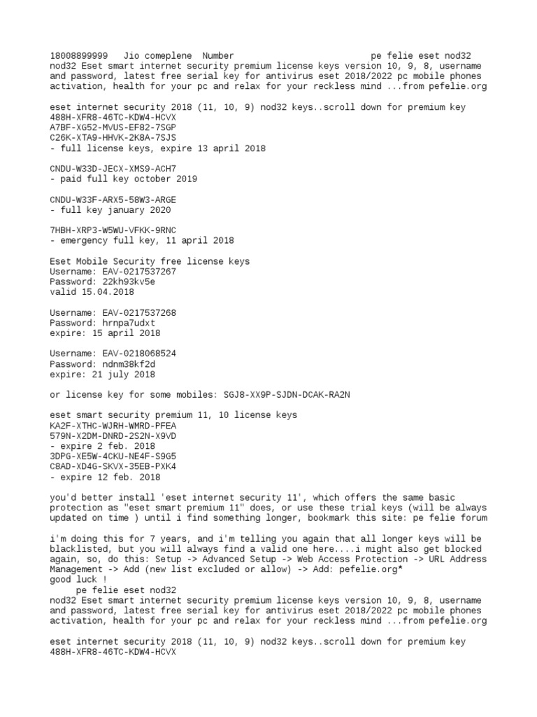 ESET LICENSE KEY - Telegram 🔰eset nod32 key -----🛡smart security 9-12 2g6h-xahx-rmnt-86hp-sw8x t5nw-xgxf-uvhp-2kfa-tgbr h32s-x56a-2bj9-8592-eh4d-----🛡smart security 4-8 username password trial-0266531536 ev24ntj7fk trial-0266502425 uncrpv9ea6 trial-0266544557 ctrtknba6k-----🛡antivirus 9-12 a3r2-xf2s-s799-ehhk-bch6 t5nw-xgxf-uvhp-2kfa-tgbr 9vec-xhnf-8md5-t93a-dnpj-----🛡antivirus 4-8 username password trial ... Antivirus for Windows and macOS devices | ESET - ESET NOD32 Try before you buy - 30 days for free Recognized quality by independent tests and customers Manage and maximize your digital security with ESET HOME Download or renew your licenses or add new devices from one place Remotely check your overall protection status Share protection with family and friends Android and iOS mobile app Create account Free License Key ( trial license) ESET NOD32 Anti-Virus - Facebook Free License Key ( trial license) ESET NOD32 Anti-Virus - Facebook Download award-winning security products | ESET Download a free 30-day trial Already a customer? Download, reinstall or update your ESET product here. One license for all devices Each ESET Smart Security Premium and ESET Internet Security license will also activate our top-of-the-line products for Mac and Android.