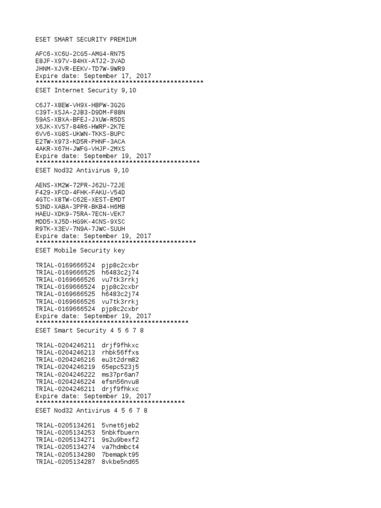 ESET nod32 keys | 30 days trial license for free Free ESET NOD32 keys valid until 2023-May-18. Trial License activation key for 30 days for ESET NOD32 Antivirus, ESET NOD32 Internet Security, ESET NOD32 ...